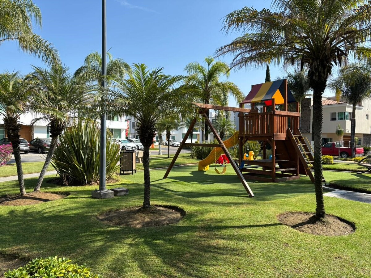 – Espacios recreativos: Alberca, cancha multiusos, área de juegos infantiles, aparatos para ejercitarse al aire libre, terraza y salón multiusos.