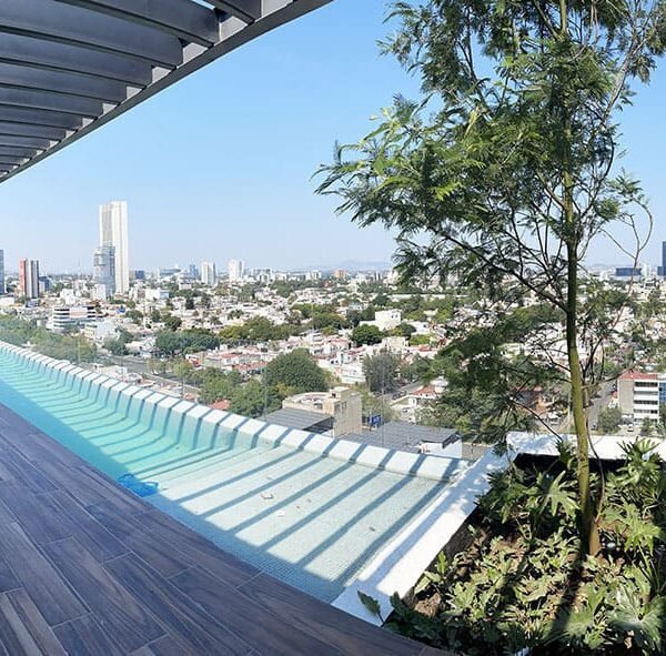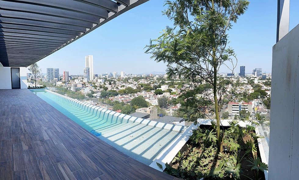 EL DESARROLLO TIENE ALBECA PANORÁMICA CON TERRAZA, GIMNASIO, ZONA DE YOGA O PILATES, Y ROOF TOP CON VISTA PANORÁMICA A TODA LA CIUDAD
