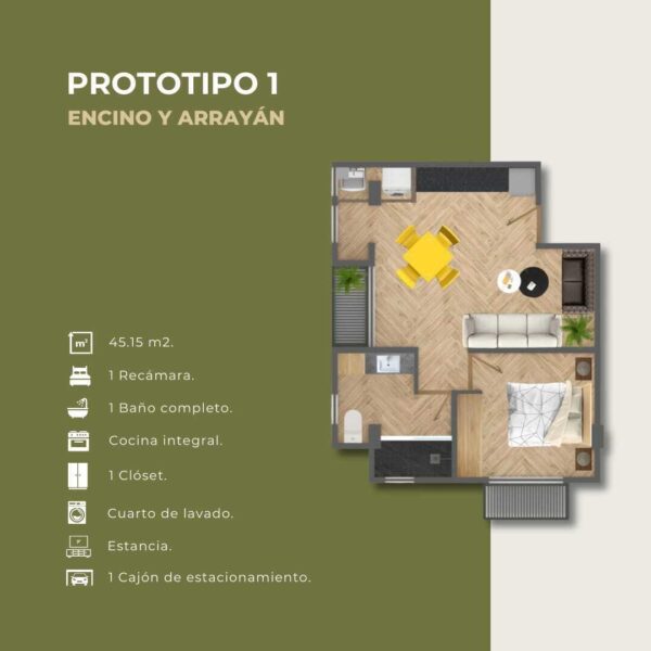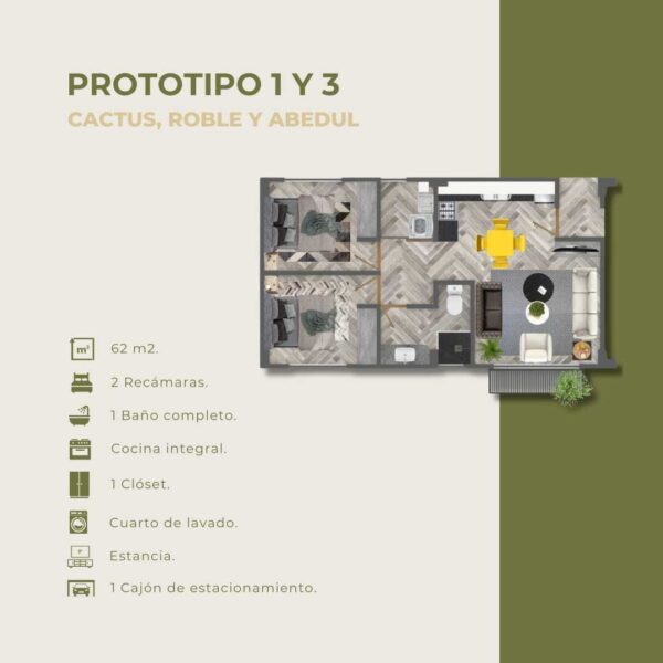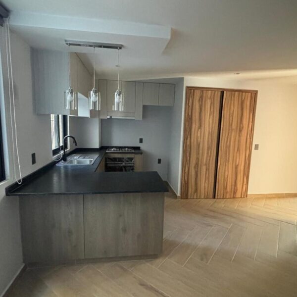 Este departamento cuenta con dos recámaras, un baño completo. cocina integral, sala comedor, cuarto de lavado, estancia y estacionamiento para un auto.