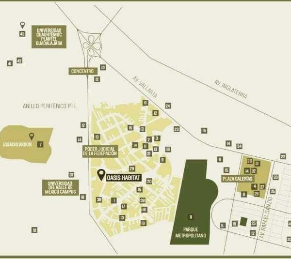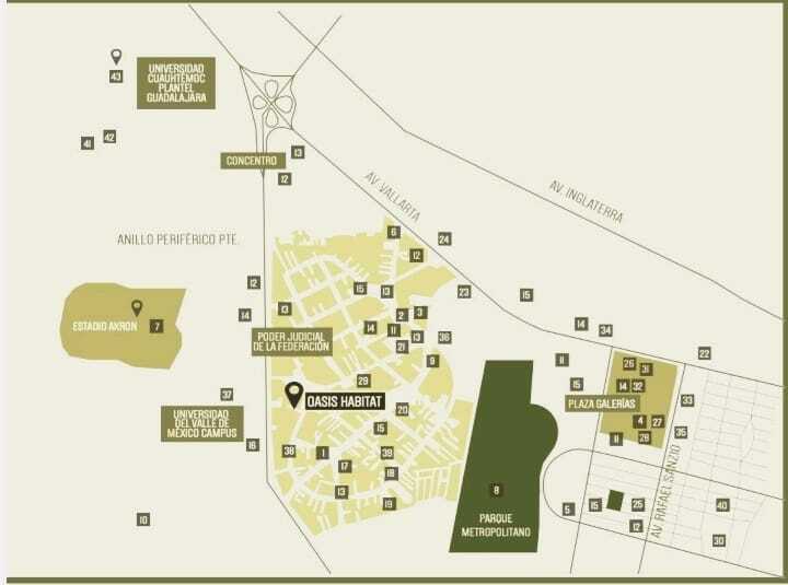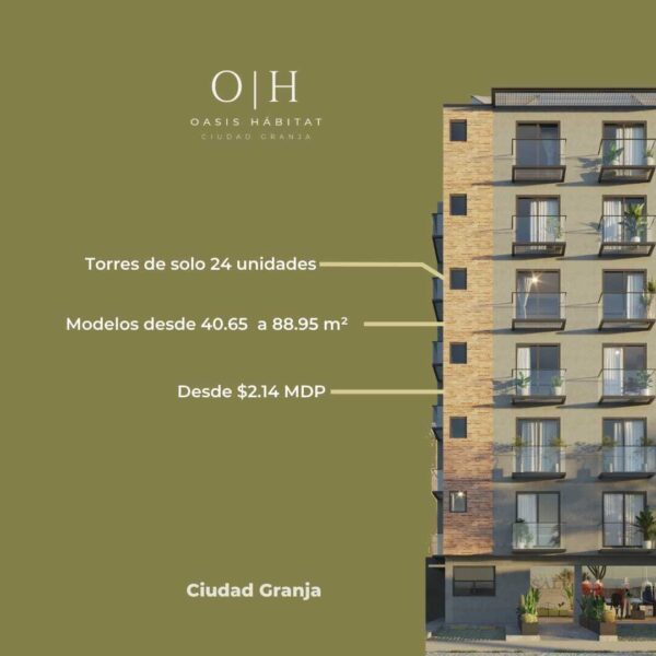 Oasis Habitat está compuesto por cinco torres de seis niveles cada una, con un total de 120 departamentos. Tiene un local comercial en la planta baja, gimnasio, roof garden en cada torre, elevadores por torre, bici puerto y caseta de vigilancia con seguridad las 24 horas.