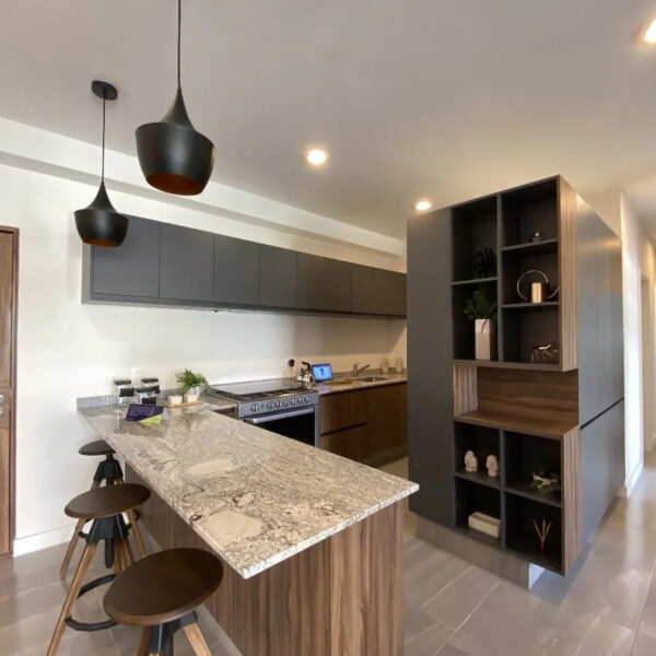 • Cocina con Barra: Diseño moderno y práctico que se integra a la perfección con el área social.