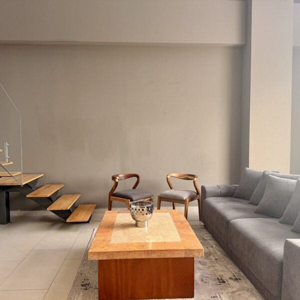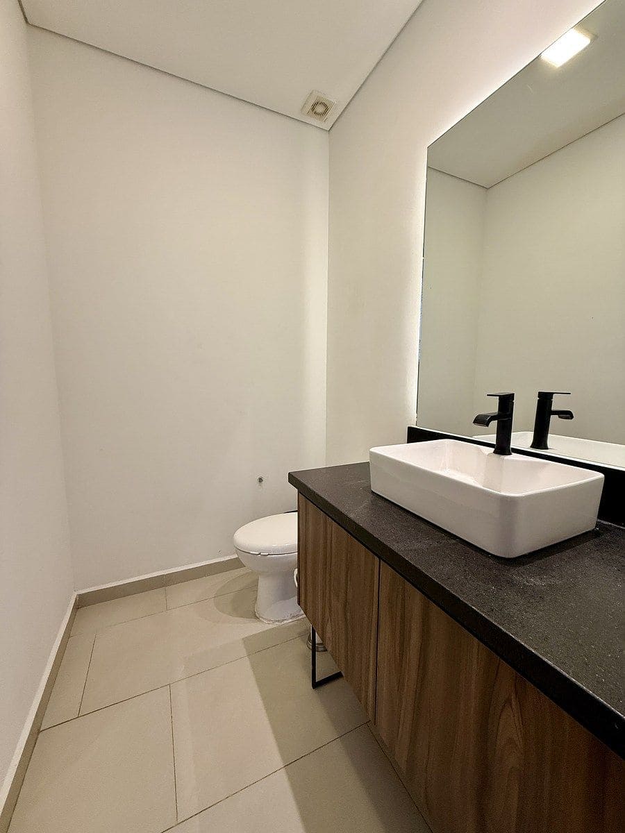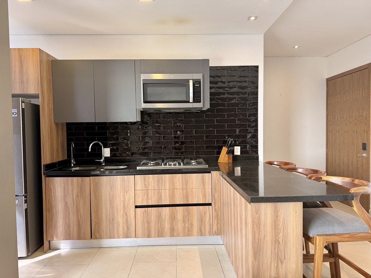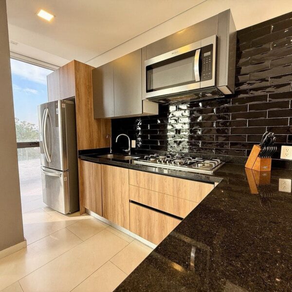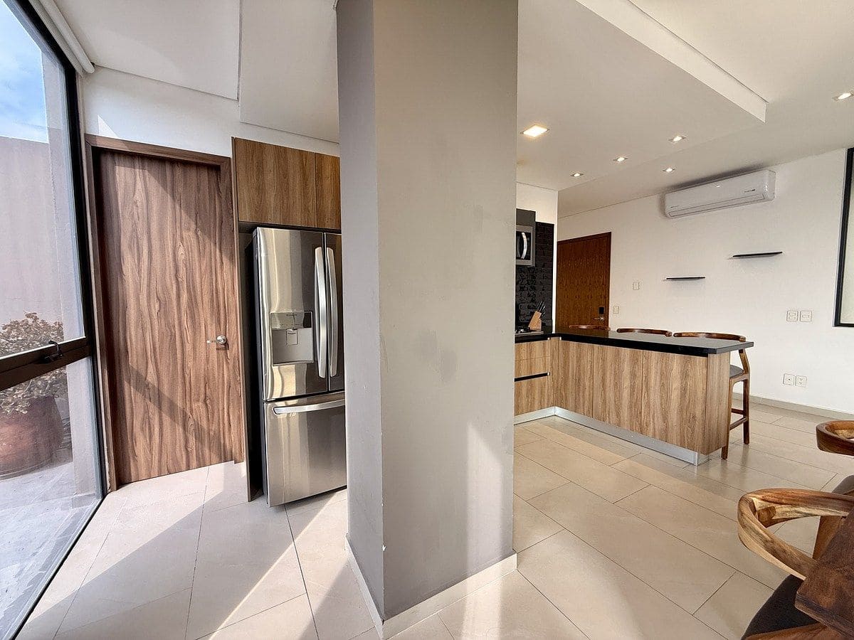 El depa cuenta con cocina integral, área de sala y comedor, área de lavado y medio baño de visitas en planta baja.